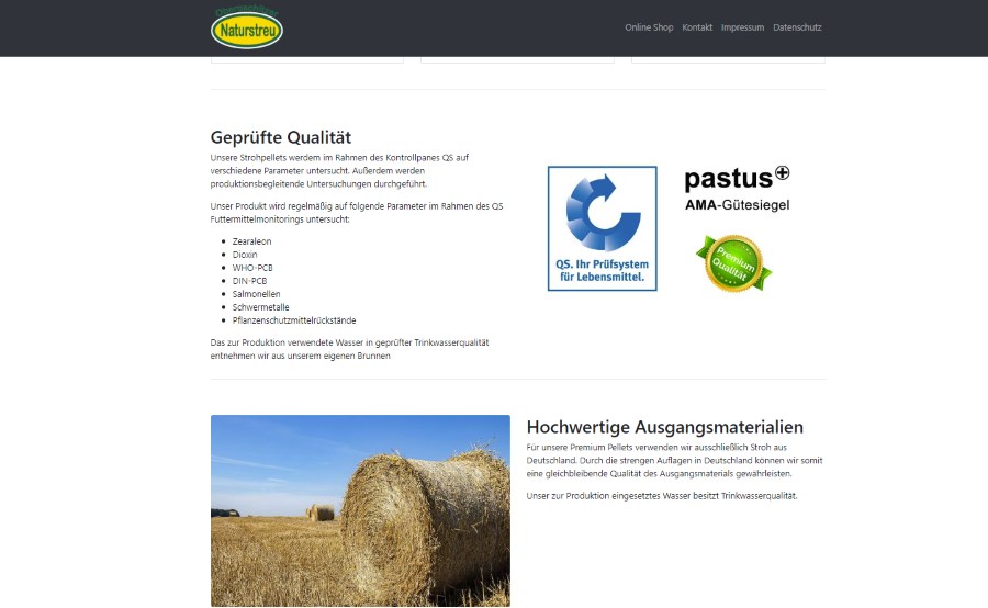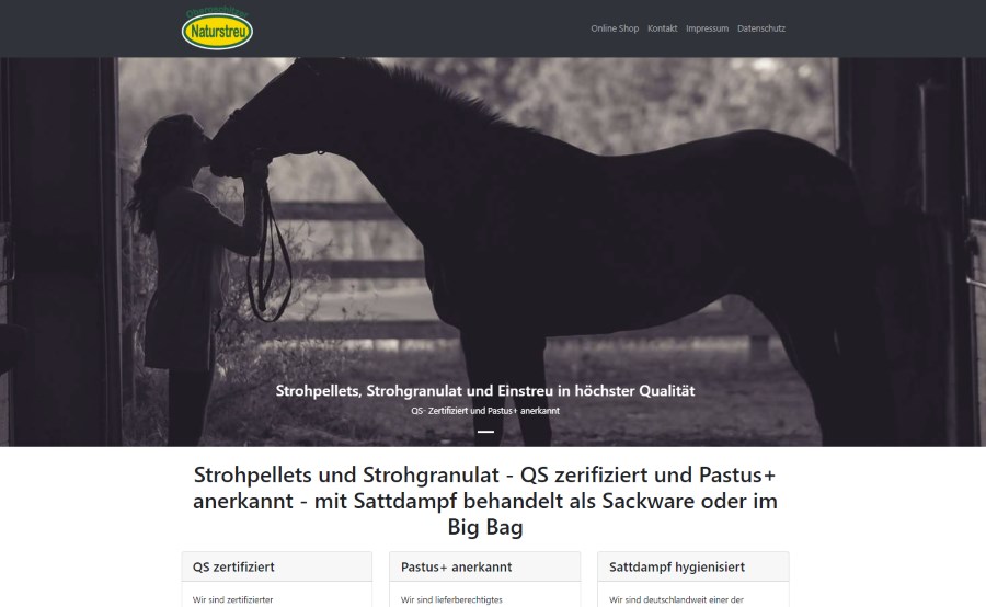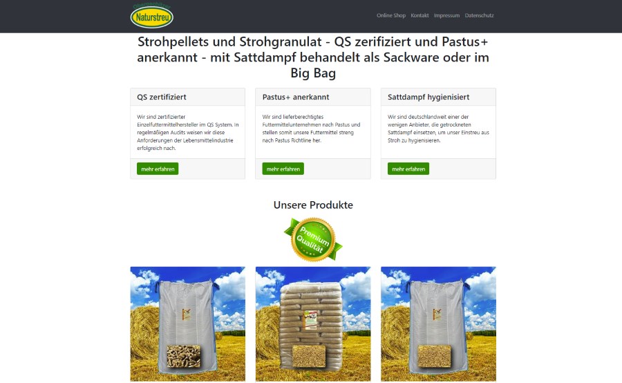 Für die Trockenfutter GmbH in Oberoschitz (Thüringen) durften wir bereits einen Online Shop im Jahre 2016 erstellen. Nun gilt es die Sichtbarkeit des Angebotes von Strohpellets, Strohgranulat und Einstreu QS- Zertifiziert und Pastus anerkannt in den Suchergebnissen zu erhöhen. Hierfür entwickelten wir ein Landingpagekonzept auf Bootstrap 4 Basis mit suchmaschinenoptimierten Rich Snippets und eigener Domainverarbeitung. Nach bereits 1,5 Monaten überholte die Landingpage die Webshopseite in den Suchergebnissen.